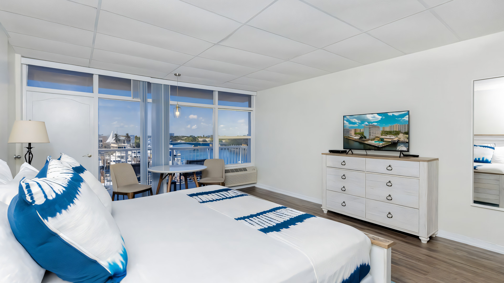 Step into the Premier Waterfront room and enjoy breathtaking views from your private balcony, along with modern comforts and stylish furnishings perfect for a relaxing getaway.